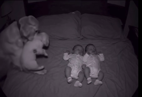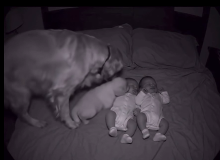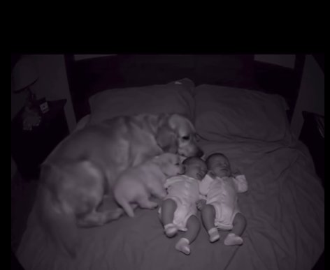 A home security camera captured a tender moment that melted hearts online. In the footage, a family dog gently carried her puppy onto the bed, placing it next to the family’s twin babies.