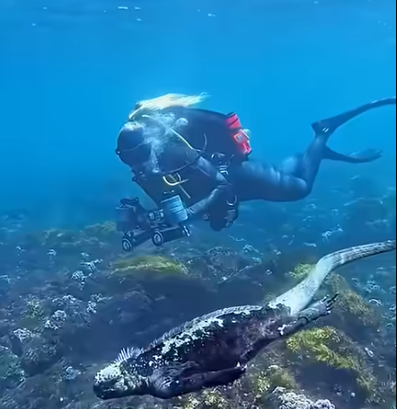 A sea iguana swims calmly beside a diver with a camera, showing off its prehistoric form like a proud model.