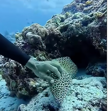 A diver reaches out toward a curious moray eel hiding in coral, showing just how much patience and respect can break the barrier between man and wild.