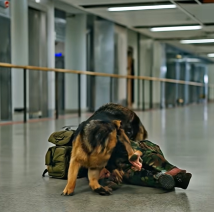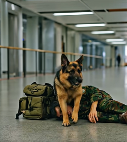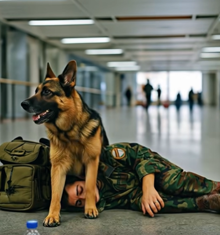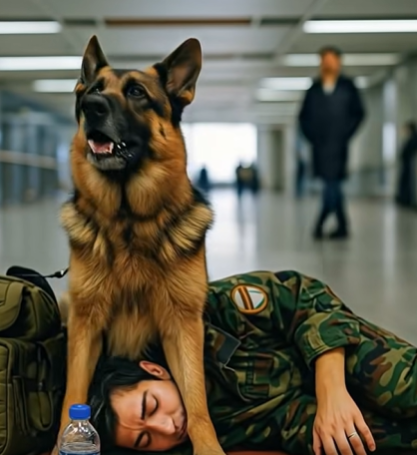 Standing tall, alert, and protective is a German Shepherd—pressed close, front paws resting over the soldier’s chest. The message is clear: You rest, I’ll guard.