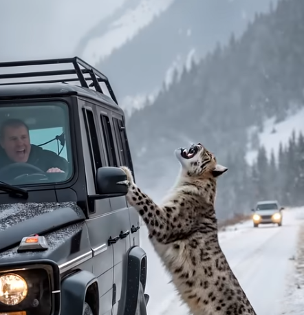 As a vehicle approached, the mother leopard turned fiercely protective. One dramatic photo shows her leaping onto a car, roaring to defend her cub.
