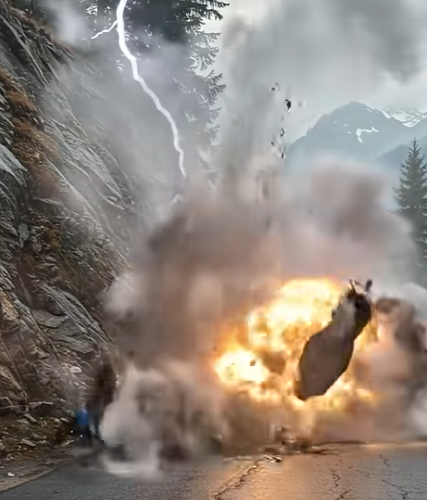 Just after the vehicle was brought to a halt and cleared… a massive explosion rocked the mountainside. Flames soared into the sky as lightning struck nearby.