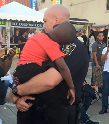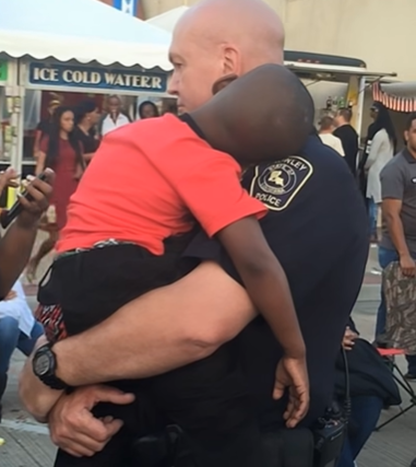 The child, dressed in a red shirt and black shorts, leans against the officer’s chest in complete trust.