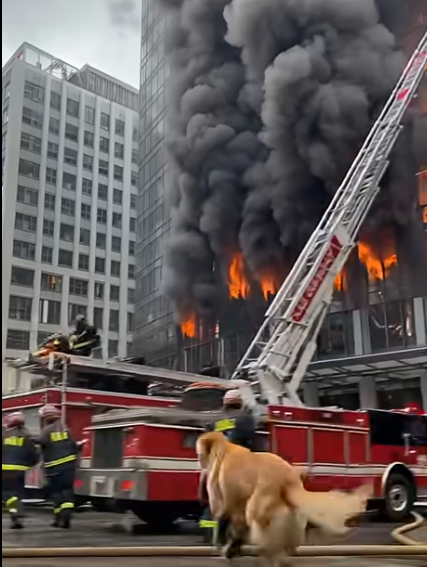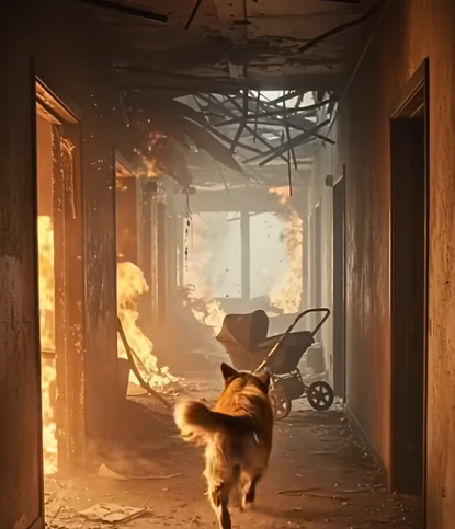 Through thick black smoke and falling debris, the dog ran through the burning corridors.