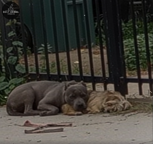 On a quiet sidewalk, people were moved to tears when they spotted a gray pit bull lying beside his lifeless furry friend.