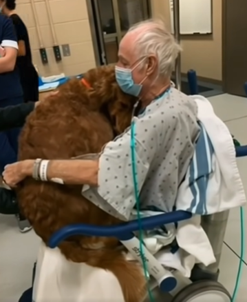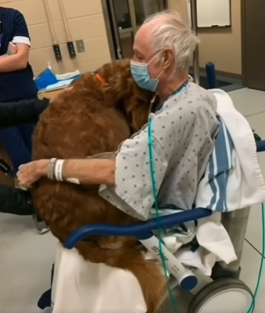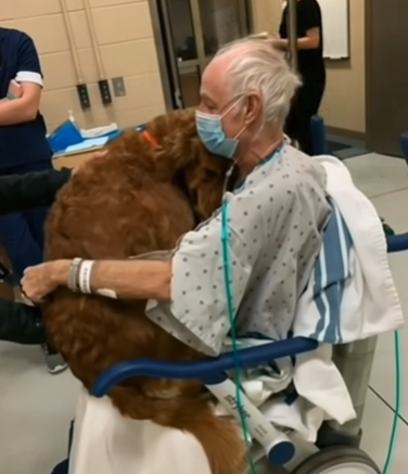 This isn’t just a visit—it’s a reunion. The dog presses in close, almost melting into the man’s hospital gown, as if trying to erase every moment of separation.