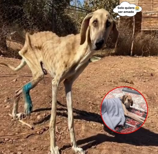 In the first image, the dog appears frail, underweight, and visibly suffering — with sadness in his eyes and the words “Solo quiero ser amado” (“I just want to be loved”).