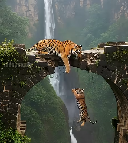 Beneath her, a terrifying scene unfolds—a tiger cub clings desperately to life, dangling from the edge by a paw, eyes wide with fear.