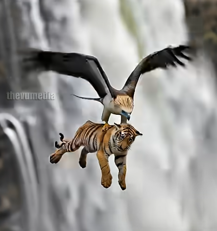 The eagle catches the young tiger midair, lifting it with a strength that seems almost mythical.