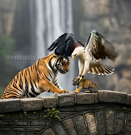 Back on the bridge, the mother tiger watches as the eagle gently places the cub beside her.