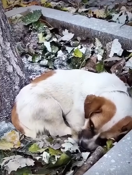 In the final shot, the dog appears to be getting more comfortable, curling up and resting in the leafy bed.