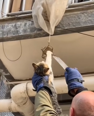Thankfully, help soon arrived. A rescuer equipped with gloves and tools carefully approached the frightened cat.