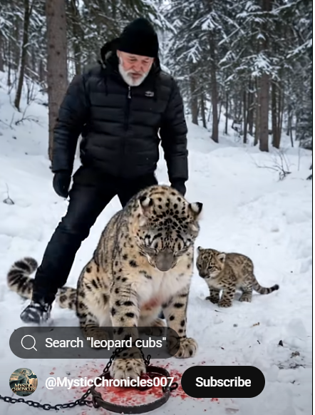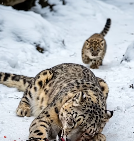 Following behind is the cub’s mother, a powerful snow leopard dragging a wounded leg, likely caught in a hunter’s trap.