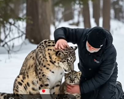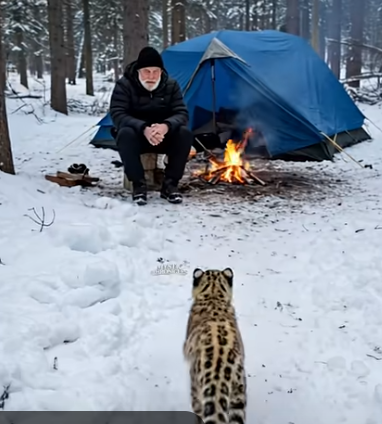 In the heart of a remote, snow-covered forest, a man camping in solitude is unexpectedly approached—not by fellow hikers or hunters, but by a snow leopard cub cautiously padding its way toward the warmth of his campfire.