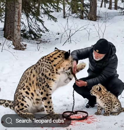 Noticing the bloodied trap clamped around the mother leopard’s paw, the man decides to intervene.