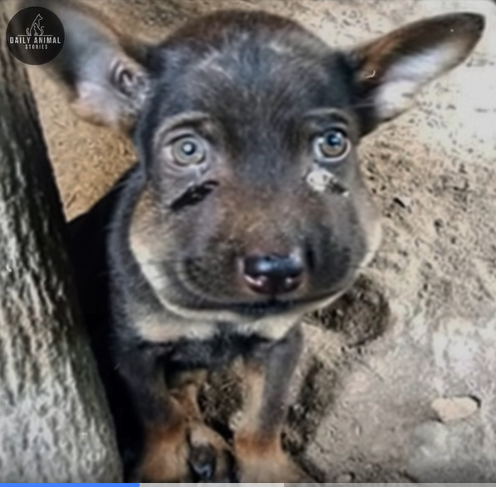 A tiny puppy with tear-stained eyes was discovered alone near a tree, its frail body showing signs of neglect and sadness.