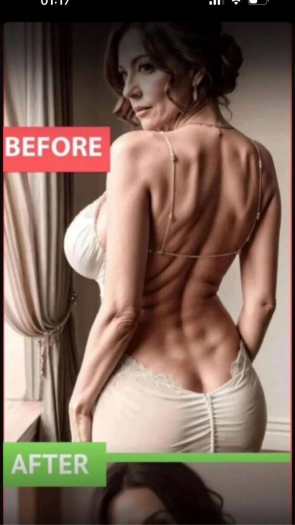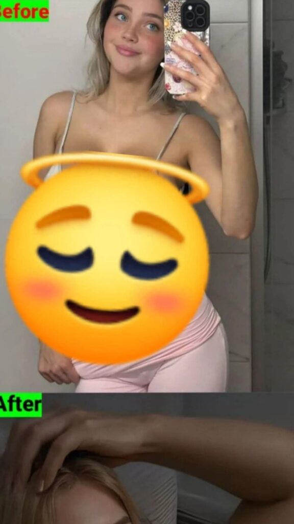 One look at her “before” pic and you’d never guess what’s coming next. Soft smile, no makeup drama, casual vibes