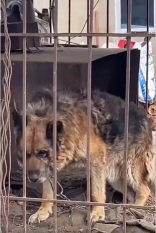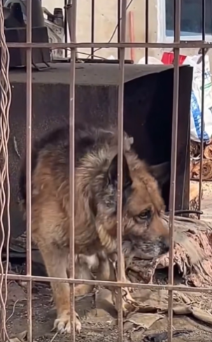 In a small, rusted cage, an old dog stands quietly, chained and weary.