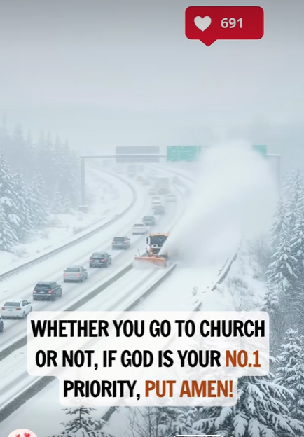 The images show a snowy highway where cars carefully follow behind a snowplow, clearing the way forward. Just as the