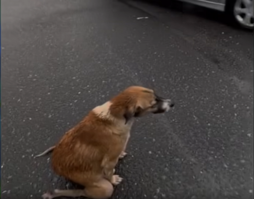 On a rainy day, a lonely dog sat quietly in the middle of the road. Cars passed by, but no