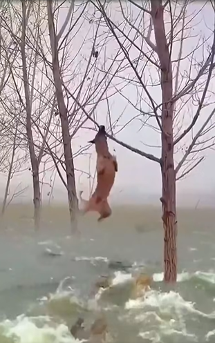 As floodwaters surged through the area, many lives were put at risk—including that of a stranded dog. Swept away by