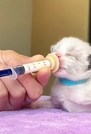 A newborn kitten, eyes still closed, is being tenderly cared for with syringe feeding. This little one is too young