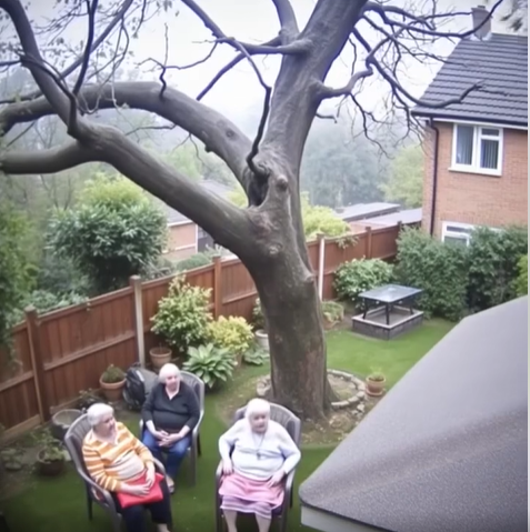 A quiet afternoon quickly turned alarming when powerful winds caused a large tree to topple in a residential backyard. Three