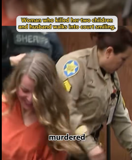 In a moment that left onlookers stunned, a woman accused of killing her husband and two young children walked into