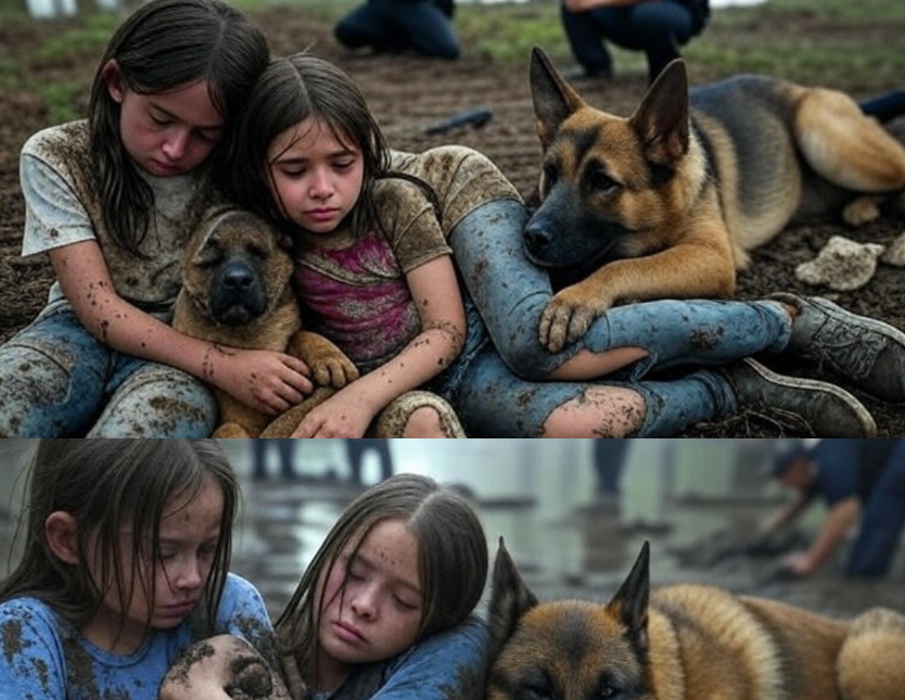 Two young girls, covered in dirt and exhaustion, sit silently in the mud. Their faces are heavy with emotion, their
