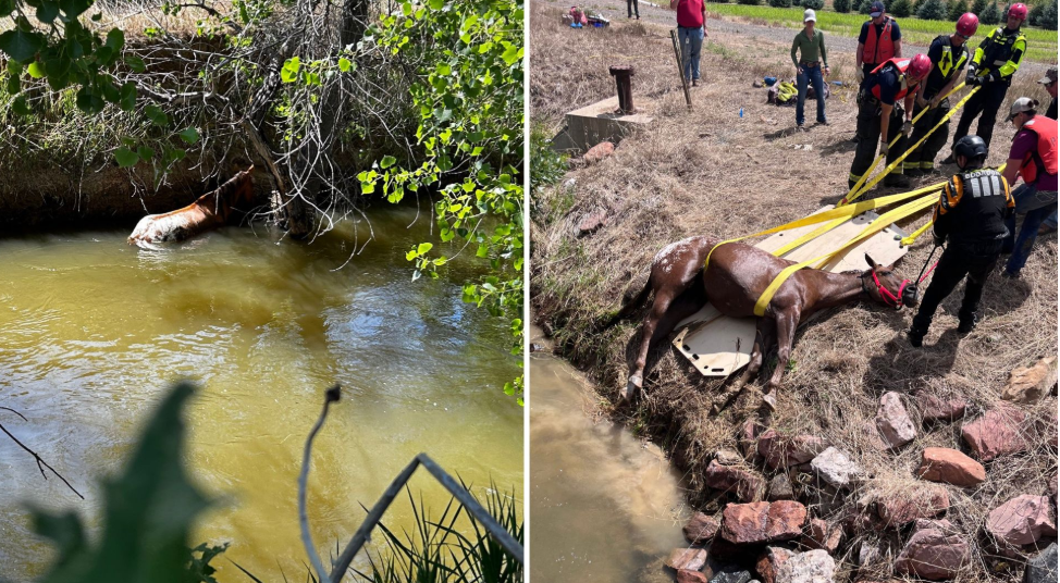 A horse was left fighting for its life after being swept into powerful floodwaters. Unable to escape the churning river,