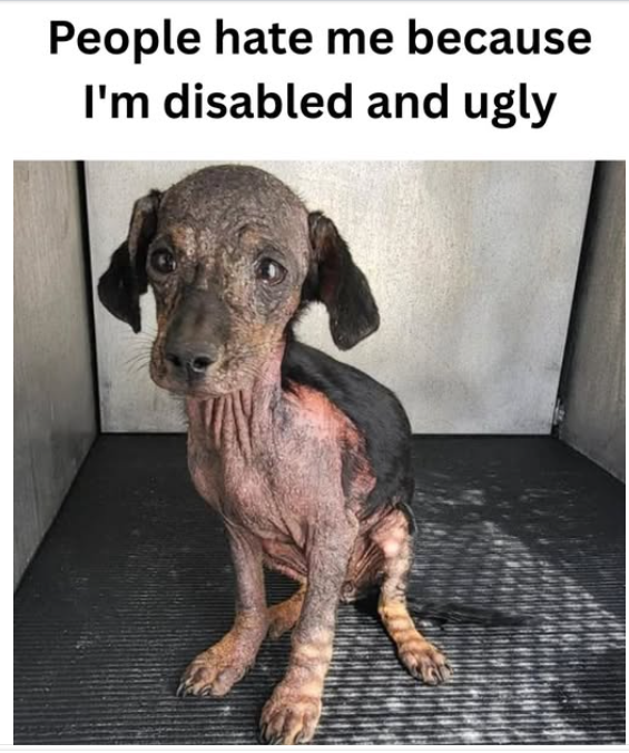 This little dog, scarred by disability and illness, carries a message that is often too painful to face. Society sometimes