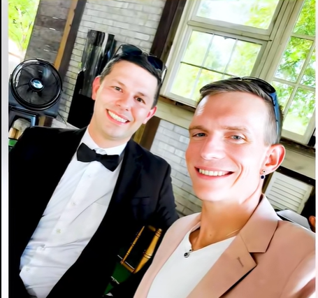 The picture features two men in formal attire, dressed in tuxedos, smiling and looking happy.