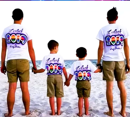 In the third image, the couple and their children are seen holding hands on a beach, all wearing matching T-shirts that say “Zurlock 2019.”