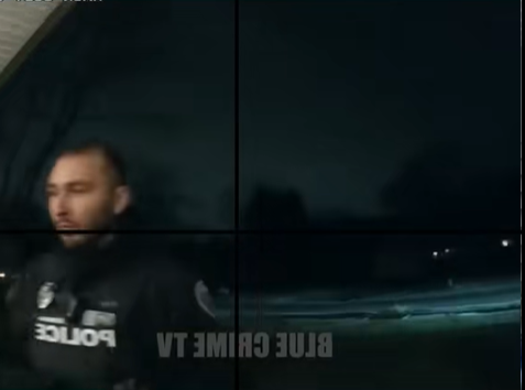 As night falls, officers are seen stepping onto the property.
