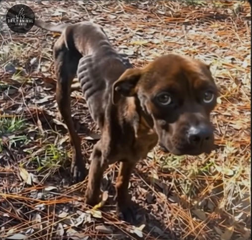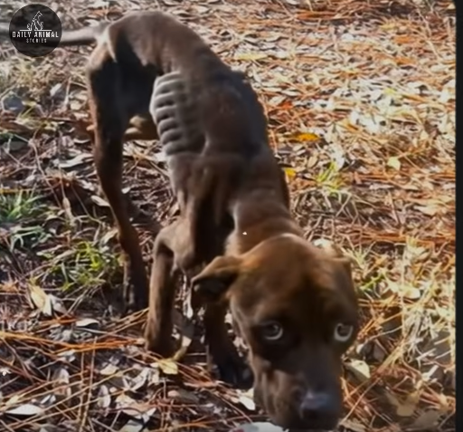 Standing in a bed of dry pine needles, the dog’s ribs and spine protrude sharply beneath its thin coat.