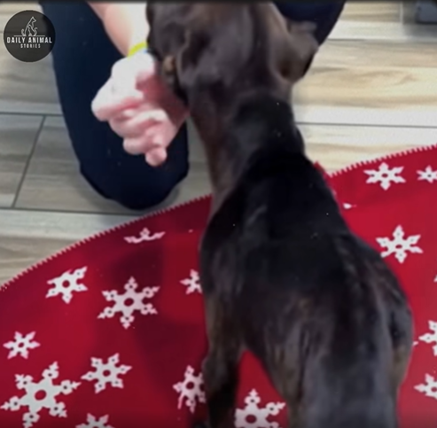 In a warmer, safer place, the dog receives gentle attention. A caring hand reaches out, offering food and kindness—something it may not have felt in a very long time.