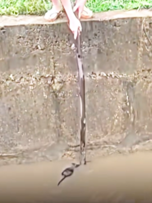 A rescuer leaned over the edge with a long stick, trying to guide the frightened animal toward safety.