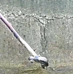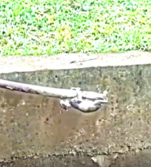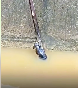 Its slick, soaked body clung to the edge of a concrete wall, surrounded by filthy water and no way to climb out.