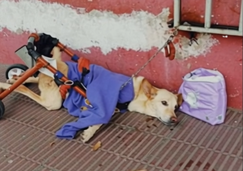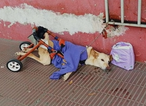 A rudimentary wheelchair supports his hind legs—but it’s clear from his posture that he’s exhausted, perhaps abandoned.