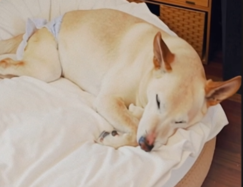 Then comes the second image: a transformation. The same dog now rests peacefully on a soft, white bed. No chains. No cold concrete. No fear.