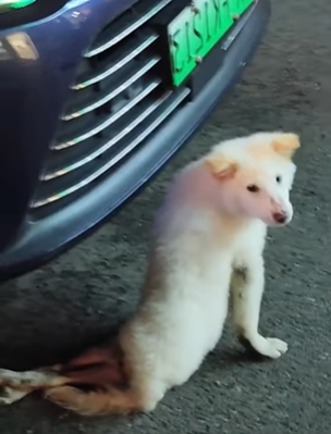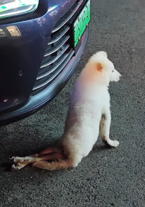 Amid the chaos of a city street, a white dog with paralyzed hind legs rests quietly in front of a parked car.