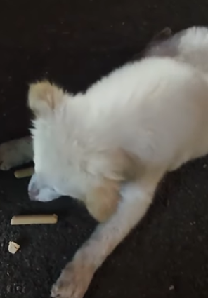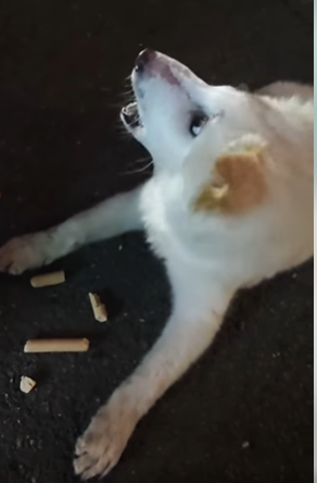 In the second image, the dog is seen eating scraps on the pavement. It may not have the luxury of shelter or comfort, but it clings to survival with fierce determination.