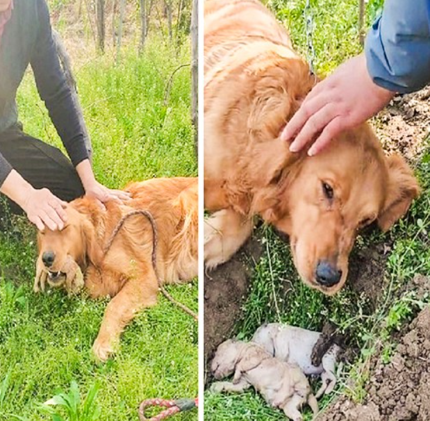 As the scene unfolds, it becomes clear why the mother dog is in such visible anguish. Nearby, tiny lifeless puppies lie in the grass.