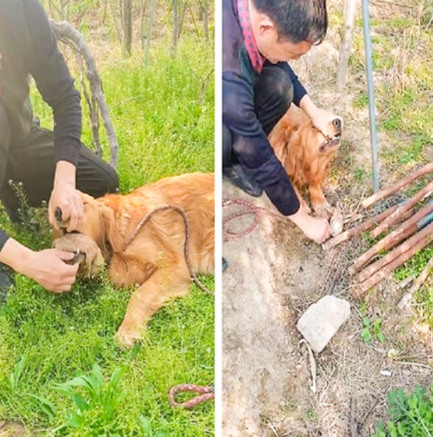 In the first moments captured, a man is seen trying to comfort and release a distressed Golden Retriever.