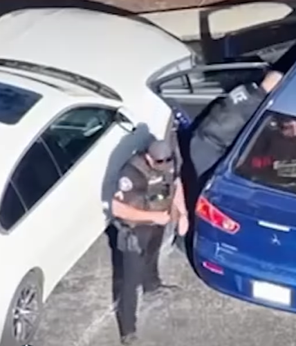 The third image shows two officers by a blue SUV and a white sedan in a parking lot.