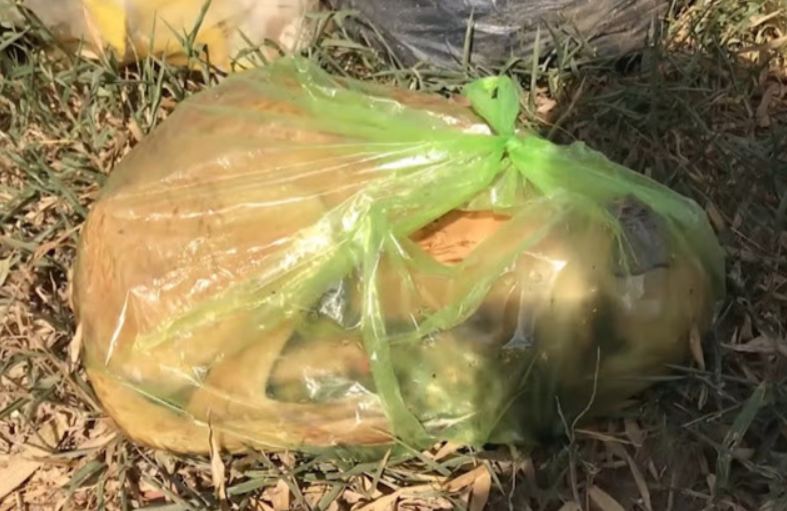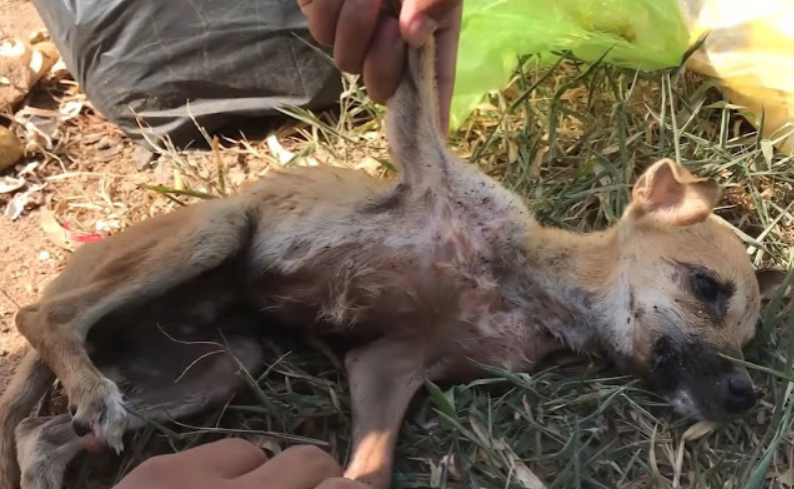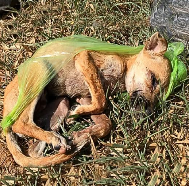 On a scorching afternoon, a passerby noticed something barely moving in the grass — a fragile, skeletal puppy wrapped in a torn green garbage bag.