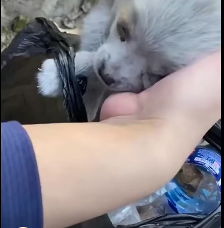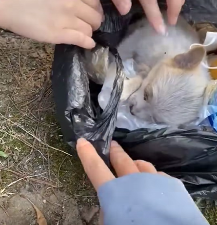 One of the rescuers gently tore open the bag, revealing the fragile pup inside. His fur was matted, and he had barely enough energy to move.