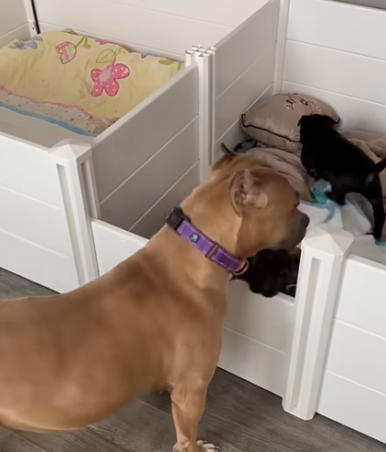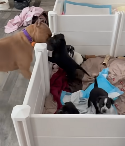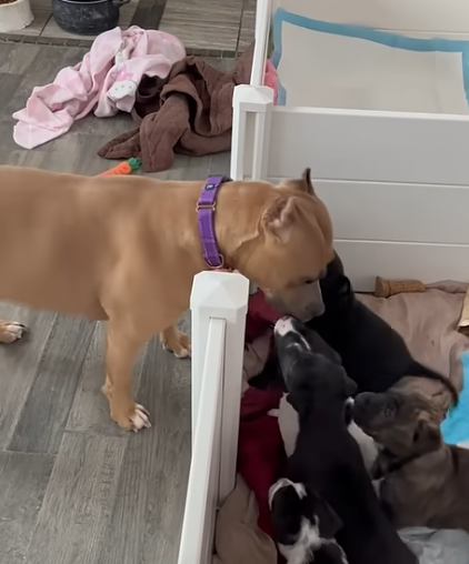 In a cozy nursery filled with warm blankets and playful yips, a loving mama dog makes her way to the puppy pens.