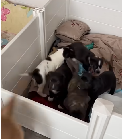 In no time, more puppies gather, climbing, sniffing, and wagging excitedly.
