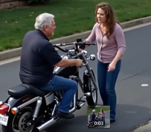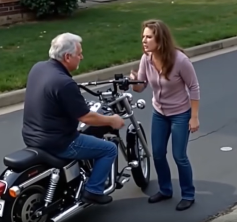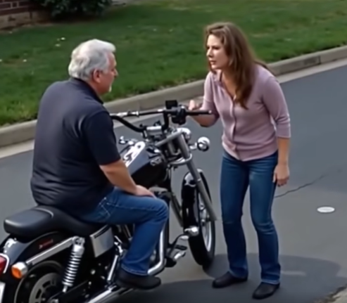 A middle-aged woman confronts her father, who’s proudly seated on a shiny new Harley-Davidson.